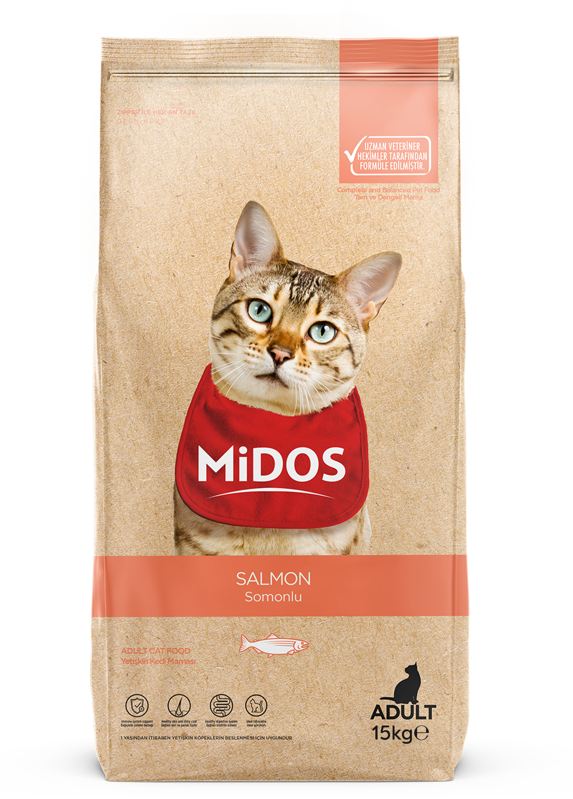 Hrană uscată pentru pisici adulte, Bado, cu somon, 5×1 kg, premium, cutie cu mâner, proteine animale, taurină și vitamine