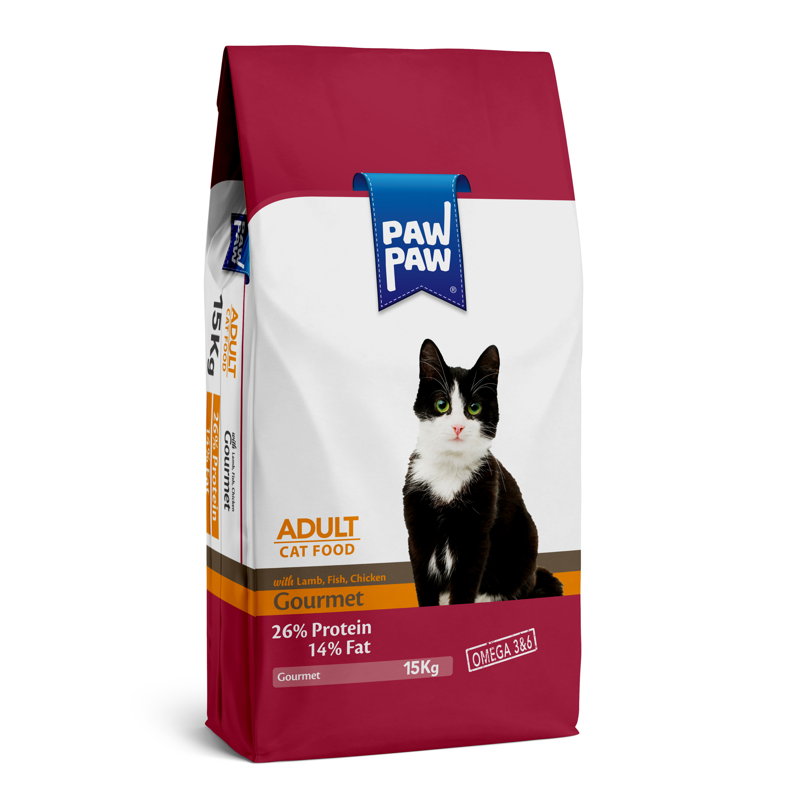 Hrană uscată pentru pisici, PAWPAW, Adult, Gourmet, pui, pește și miel, 15 kg, nutriție echilibrată, digestie optimă și imunitate puternică
