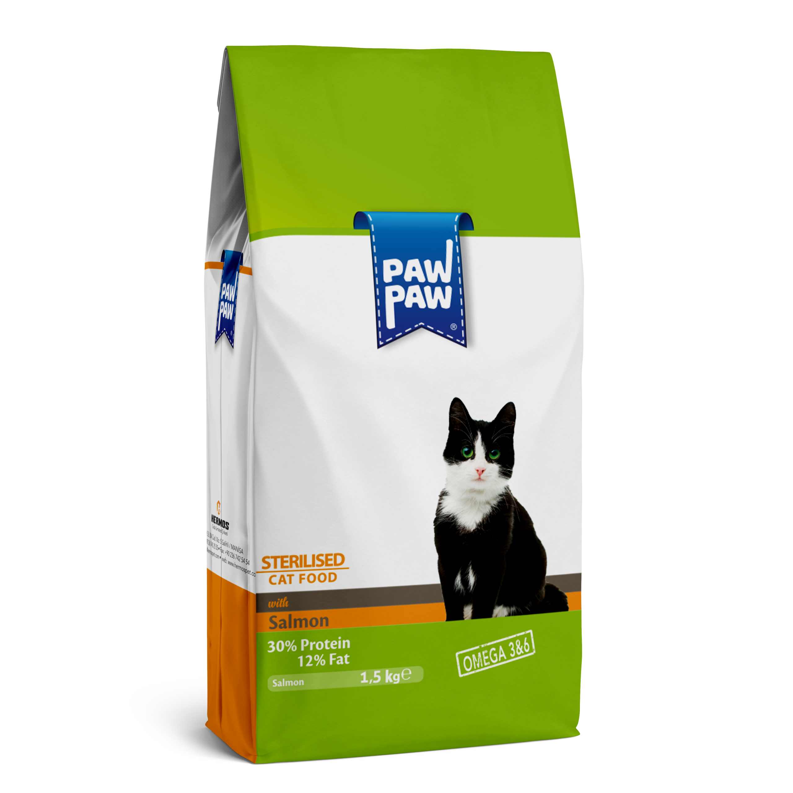 • Hrană uscată pentru pisici sterilizate, PAWPAW, carne de somon, 1,5 kg, metabolism sănătos, greutate optimă și blană strălucitoare Disponibil la parteneri