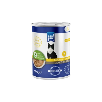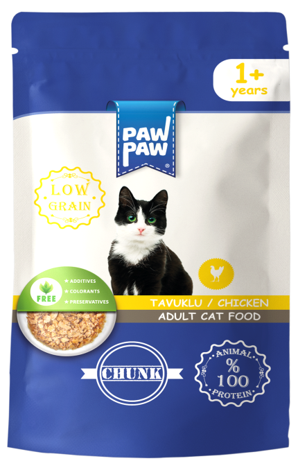 Hrana umedă PawPaw pentru pisici adulte cu bucăți de pui în sos, carne și subproduse animale, cu pui ca ingredient principal (60% din mixul de carne), 100% proteină animală, 80% umiditate, taurină și vitamine esențiale. Nutriție echilibrată, hidratare și gust irezistibil.