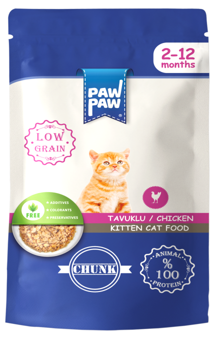 Hrana umedă pentru pisici junior PawPaw cu bucăți de pui în sos este alegerea ideală pentru puii de pisică aflați în perioada de creștere activă.