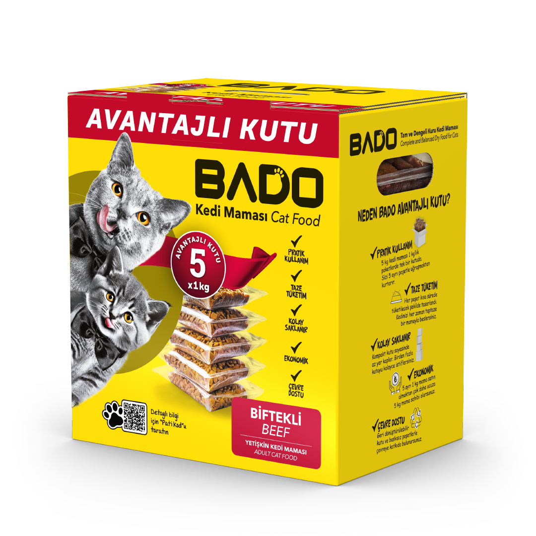 Hrană uscată pentru pisici adulte, Bado, cu vită, 5×1 kg, premium, cutie cu mâner, digestie optimă, energie zilnică, imunitate puternică
