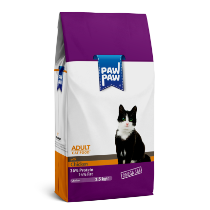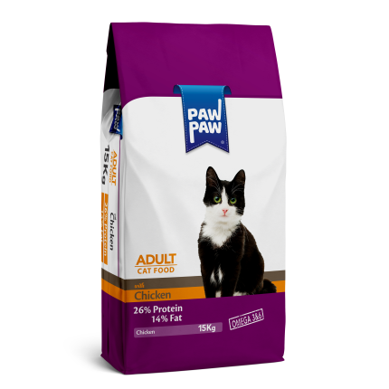 PawPaw hrană uscată pentru pisica adult cu pui, cu 26% proteine din carne de pui pentru masa musculară, taurină esențială pentru sănătatea inimii și uleiuri nutritive pentru o blană strălucitoare. Fără coloranți sau arome artificiale.