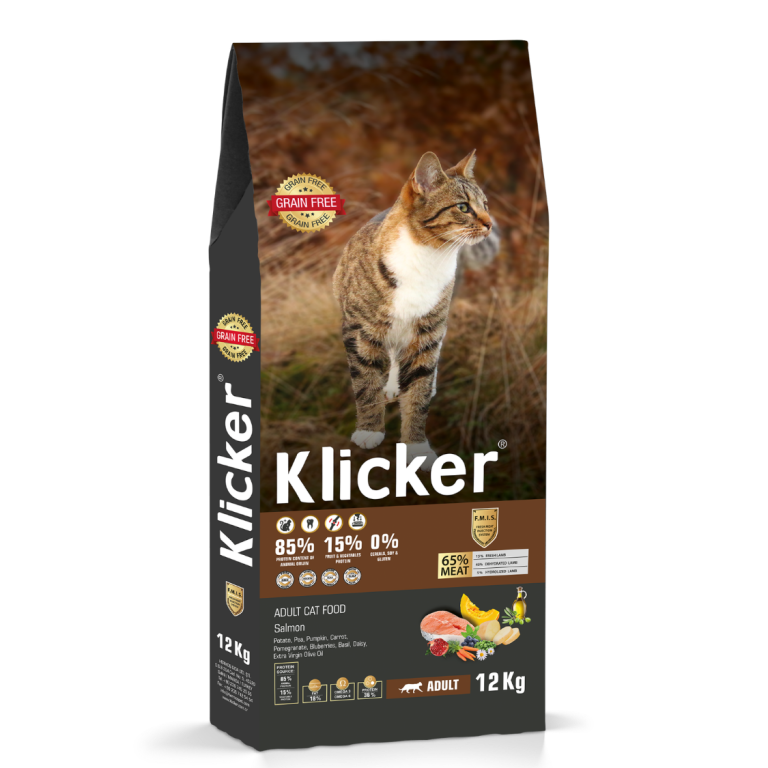Hrană uscată pentru pisici adulte Klicker cu somon, 12 kg, rețetă fără cereale, cu 85% proteine animale, taurină și antioxidanți naturali pentru sănătate și vitalitate zilnică.